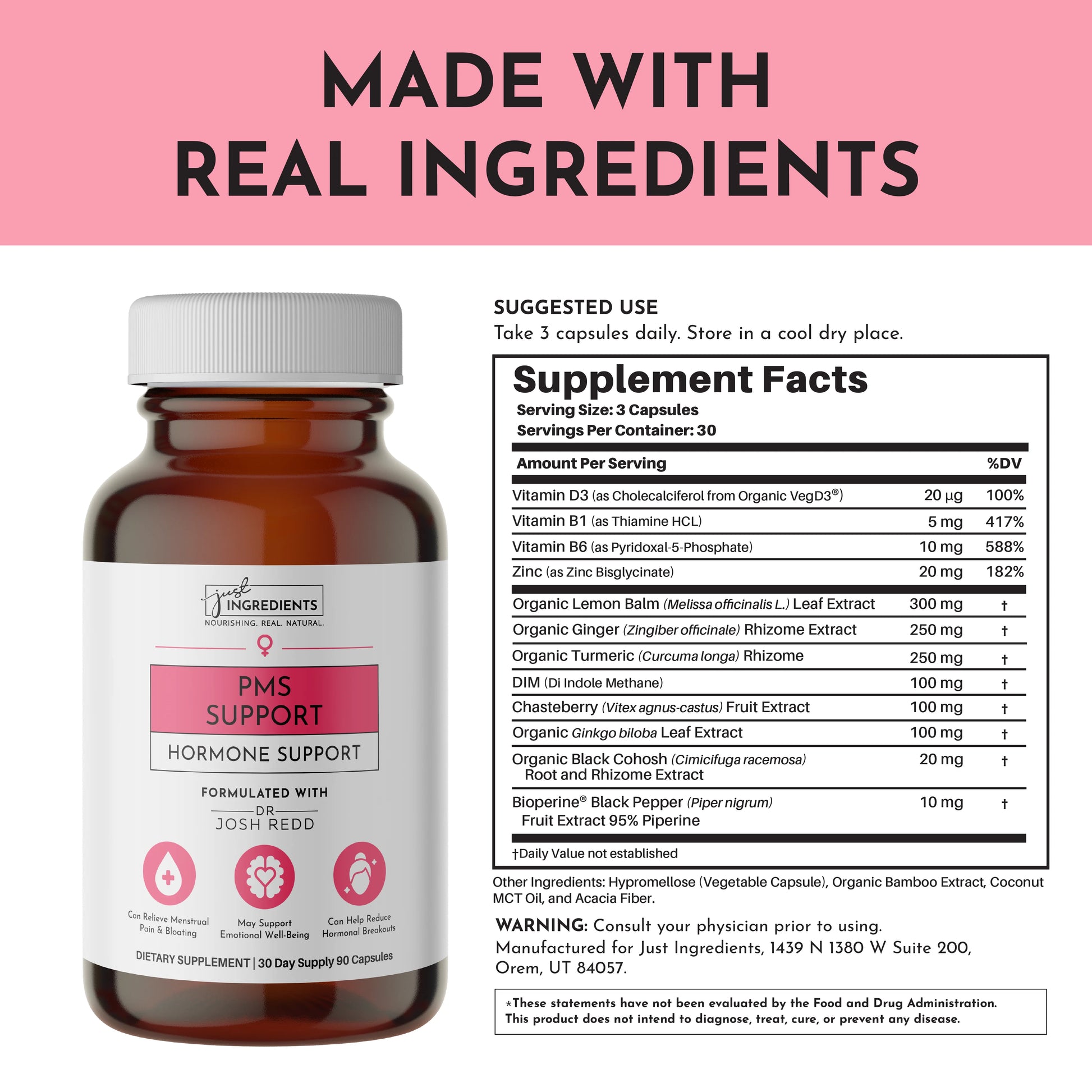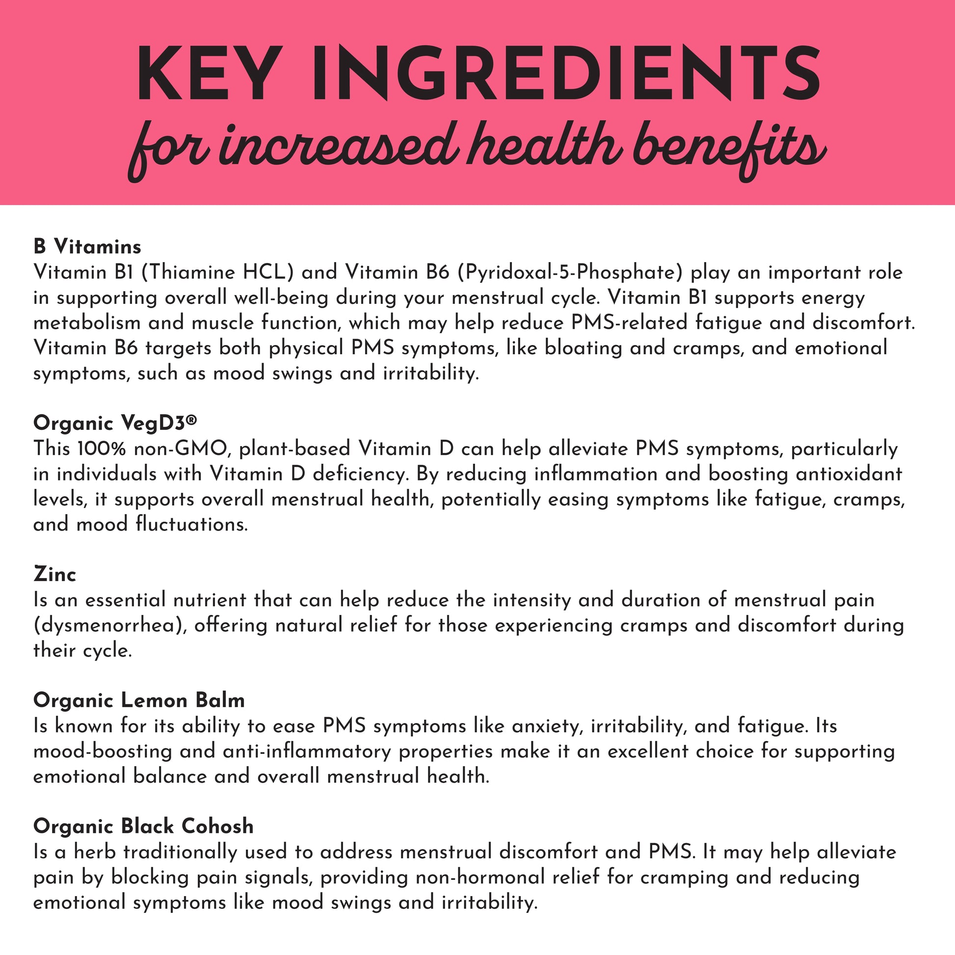 Just Ingredients PMS Complex is formulated to help support a balanced mood, physical comfort, and overall well-being throughout the menstrual cycle.* This blend features herbs, botanicals, and essential nutrients—like organic lemon balm, ginger, turmeric, chasteberry, ginkgo biloba, and black cohosh—all traditionally used to support women during their cycles. It also includes B vitamins, zinc, and DIM, along with plant-based VegD3®—a plant-based form of vitamin D3—cholecalciferol—the same form your body naturally produces. To enhance bioavailability we include BioPerine®, a patented black pepper extract shown to improve the absorption of key nutrients like vitamin B6 and turmeric.