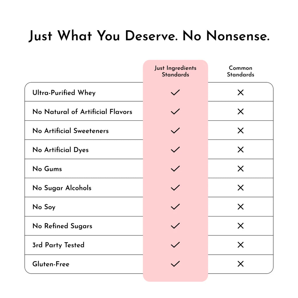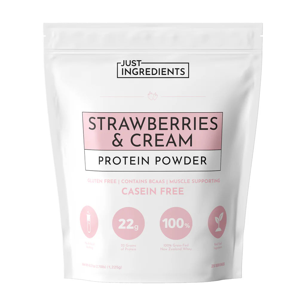 Just Ingredients Strawberries and Cream Protein Powder is made with real organic strawberries for that naturally sweet, fruity flavor. Formulated with four protein sources, including 100% grass-fed, non-denatured whey protein from New Zealand for a diverse amino acid profile. No natural or artificial flavors, no sugar alcohols, no gums, emulsifiers, or artificial sweeteners. Just real, simple goodness.